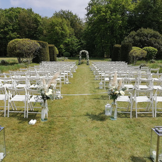 La météo était idyllique, le parc somptueux. J'ai donc sonorisé la cérémonie laïque qui se trouvait juste derrière le château. A 20h, les mariés faisaient leur entrée dans la salle sur le tube de " The Chainsmokers ft Coldplay: Something just like this"